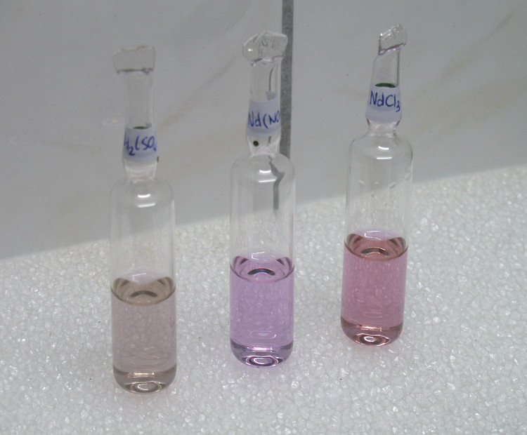 Material 2 was made from Nd-metal, which also had 99.9% purity. The metal was sold to me as an element sample, but unfortunately, when I looked at it, a few years later, I just found a heap of grey powder and a few lumps of metal, nothing useful as sample anymore. I decided to buy a new sample, ampouled under argon (which I still have to do), and use the powder and metal lumps for making Nd-sulfate. I added the grey powder and remains of metal lumps to dilute H2SO4. Dissolving the powder went quickly, but the metal lumps only dissolved with great difficulty, they were covered by a crust of Nd-sulfate. I decided to dissolve the metal lumps in 30% HCl, which works very well and this solution, together with the solution in H2SO4 I put together and I added more H2SO4 to assure strong excess amount of sulfate ions. I filtered the material using good quality filter paper and the result was a clear solution, more than 100 ml of solution. The solution has a pink/lavender color.