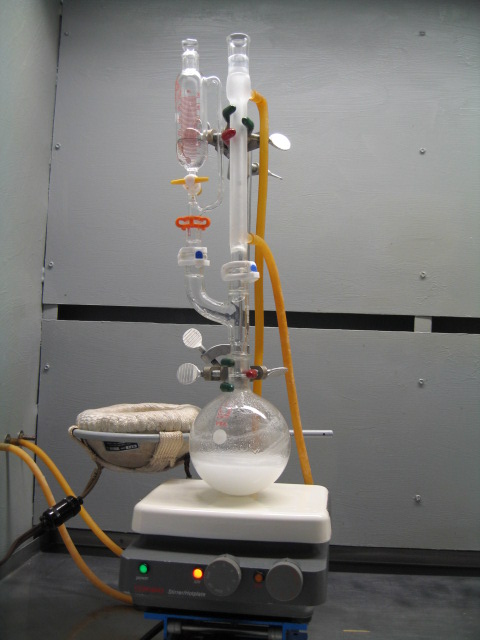 solidified droplets with water. I added some low-boiling naphtha in order to extract the product, but the naphtha only dissolved a small part of the