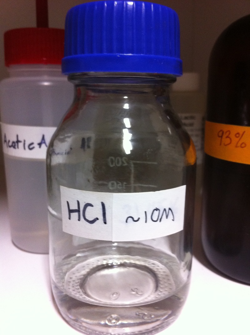 Quote: Originally posted by Texium (zts16)  | What kind of bottle is it? HCl is so insidious that it can escape from all but the best of bottles even when they are tightly closed. I keep mine in a