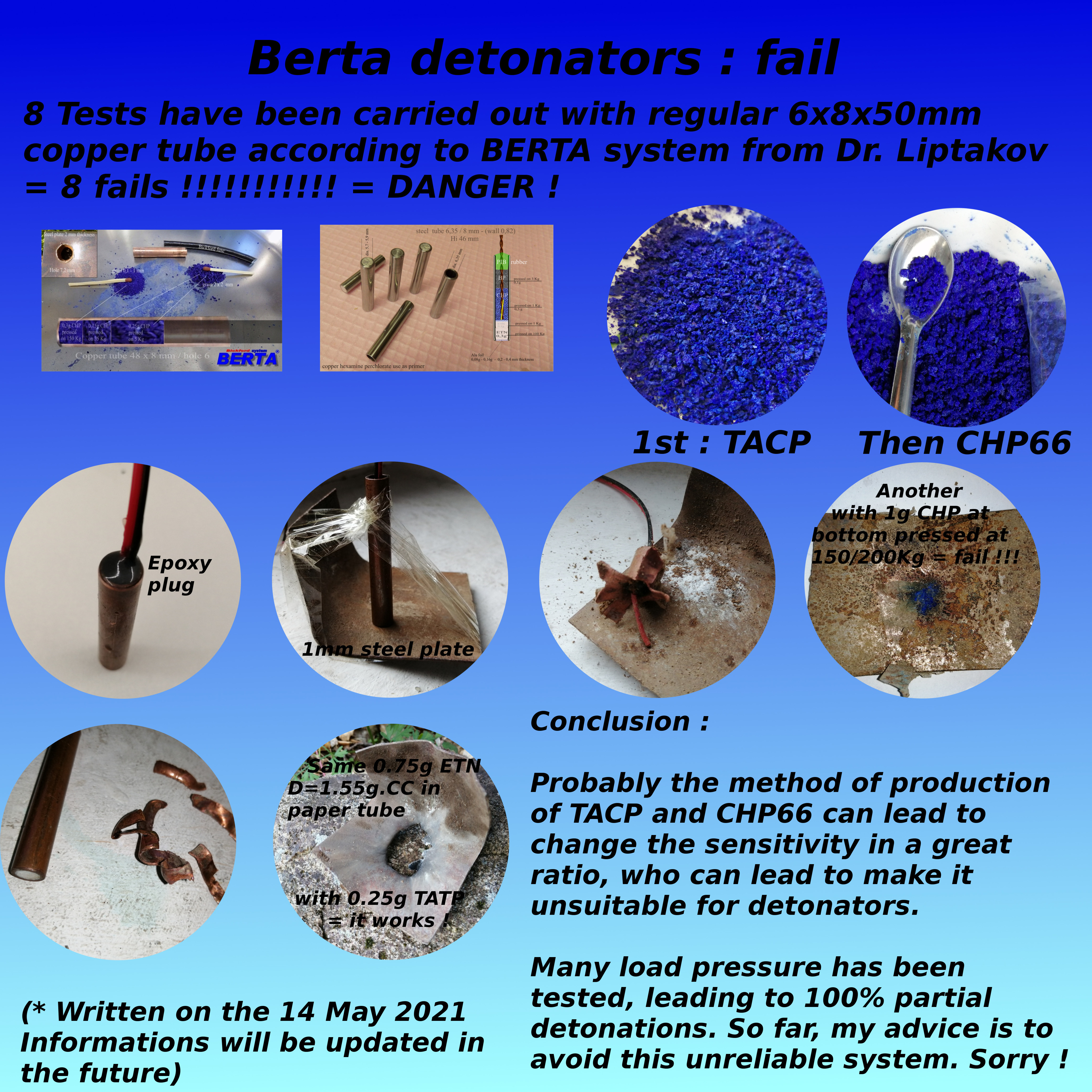 An error during the fabrication ? Difficult to believe because my TACP is working and CHP66 too but just partial detonation each time in copper tube.