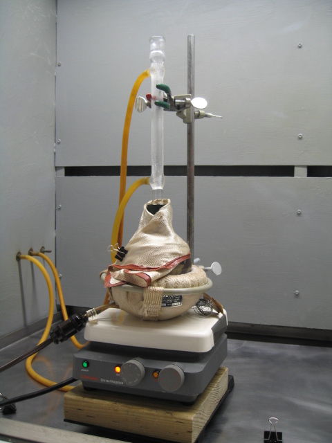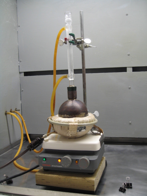 The hydrazine sulfate and NaOH were added to the RBF in that order. The 50 mL of water was then added in 10 mL portions through the condenser over a period of 5 minutes. This generated a great deal of heat and a small amount of hydrazine was seen escaping the top of the condenser. The hood fan was on, of course, as hydrazine is highly toxic. The reactants were then heated at reflux for 1.5 hours using a mantle. The reactants were stirred with a magnetic stirrer throughout the reaction.