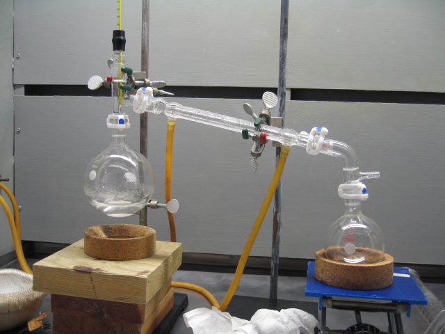 The condenser was then set for downward distillation. The distillate temperature rose as high as 133°C then dropped off. Heating was stopped at this point and the condensate left overnight in the 250mL receiving flask.