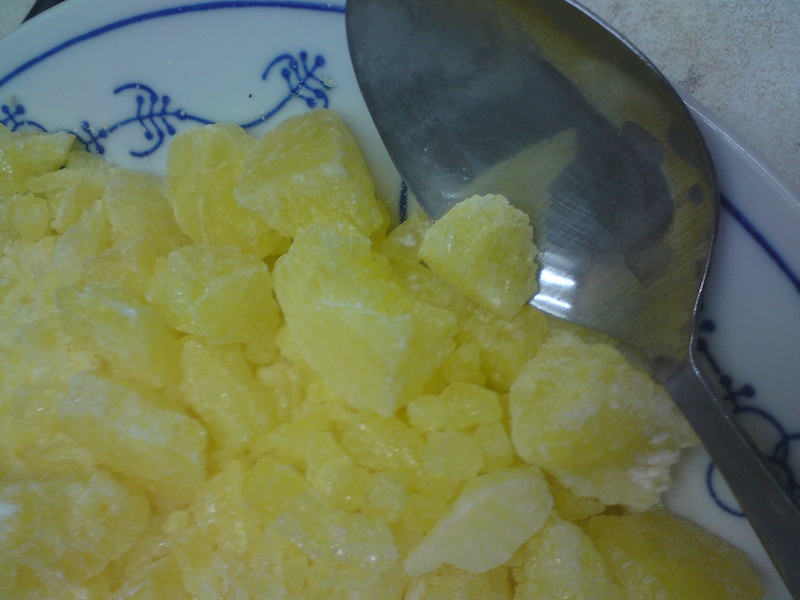 as a white sticky powder with a strong Tryptamine smell that clung to the flask. None of the tallow/orange tinting remained.