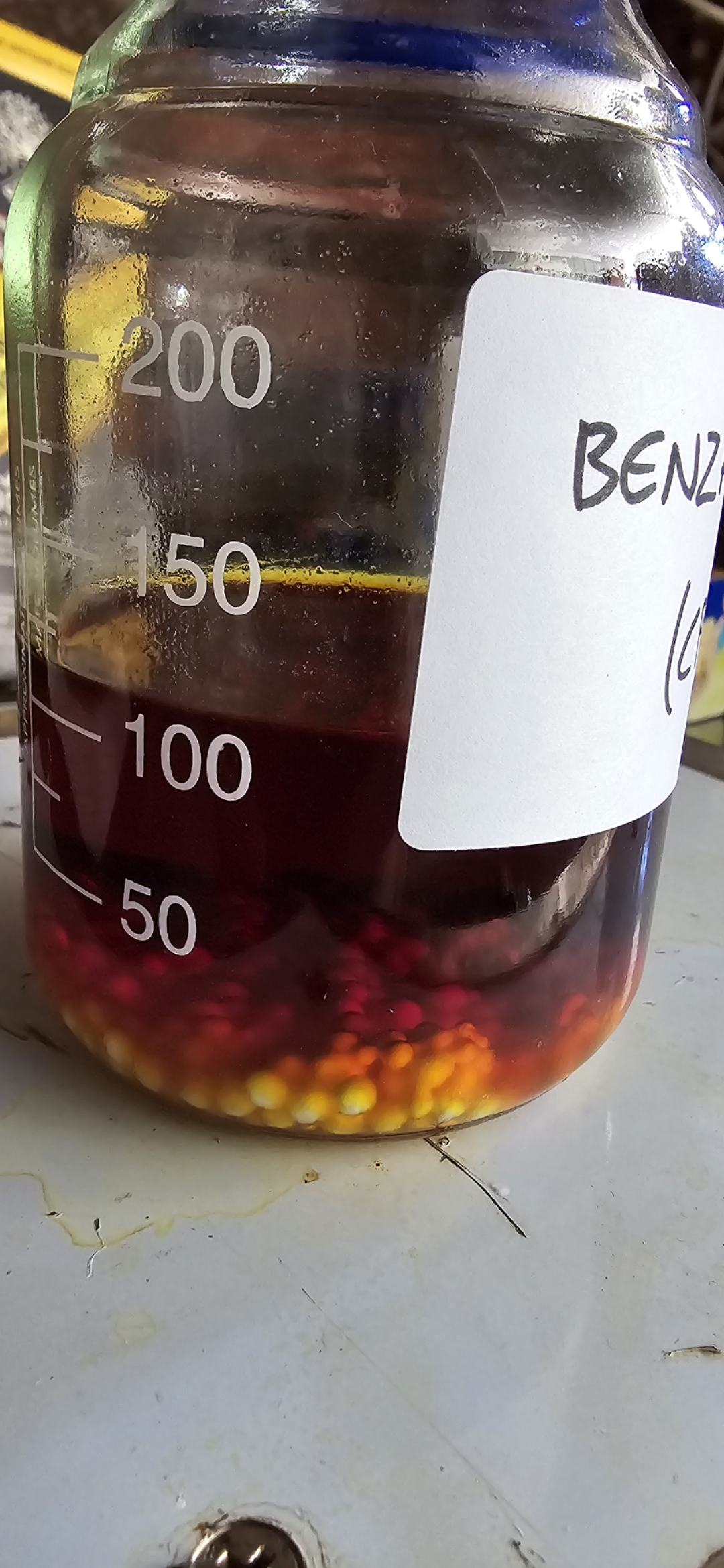 first distillate was collected, the temperature dropped. I cranked up the heat somewhat to 200 °C, the solution turned from light to dark yellow then
